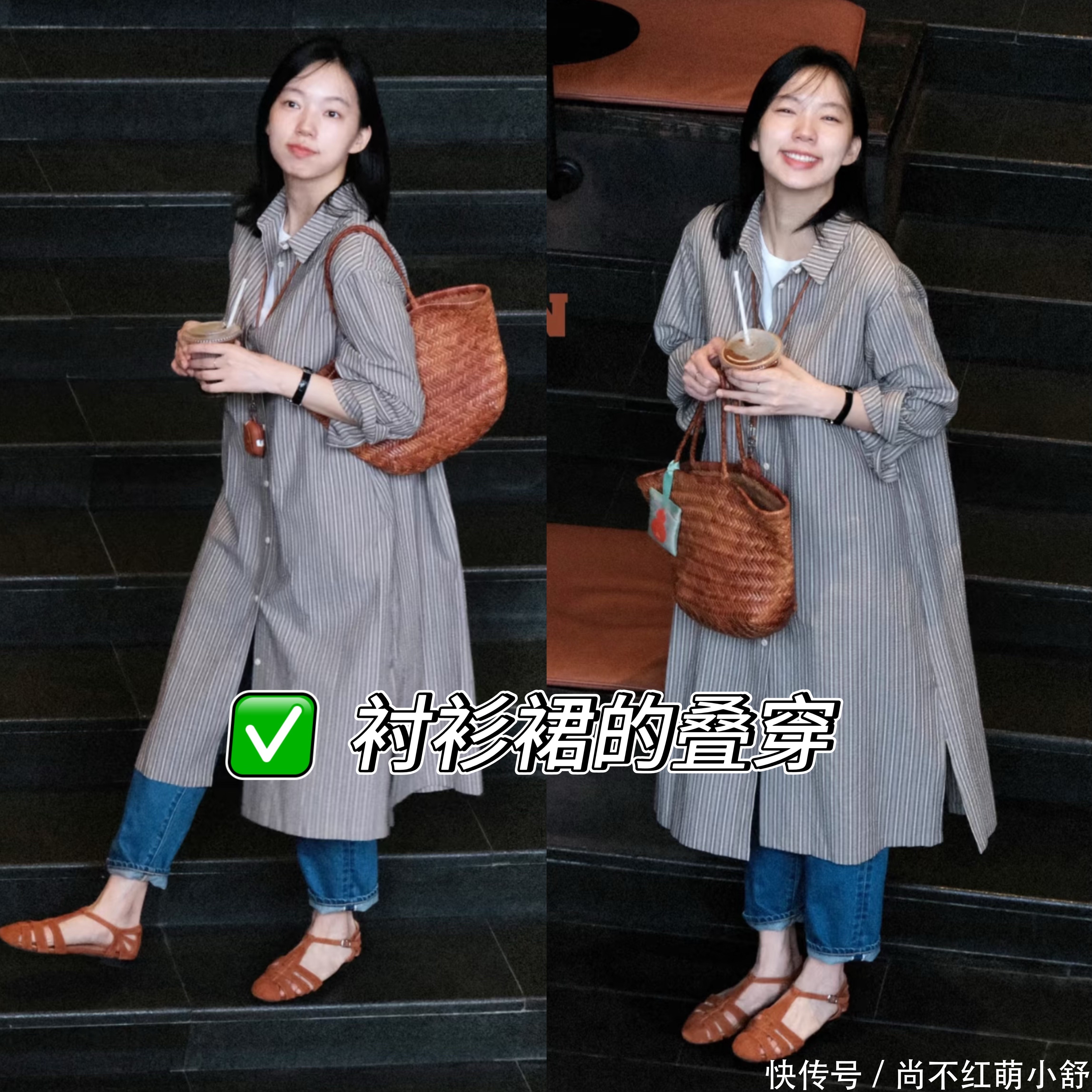 look2、衬衫裙+牛仔裤,时髦又通勤