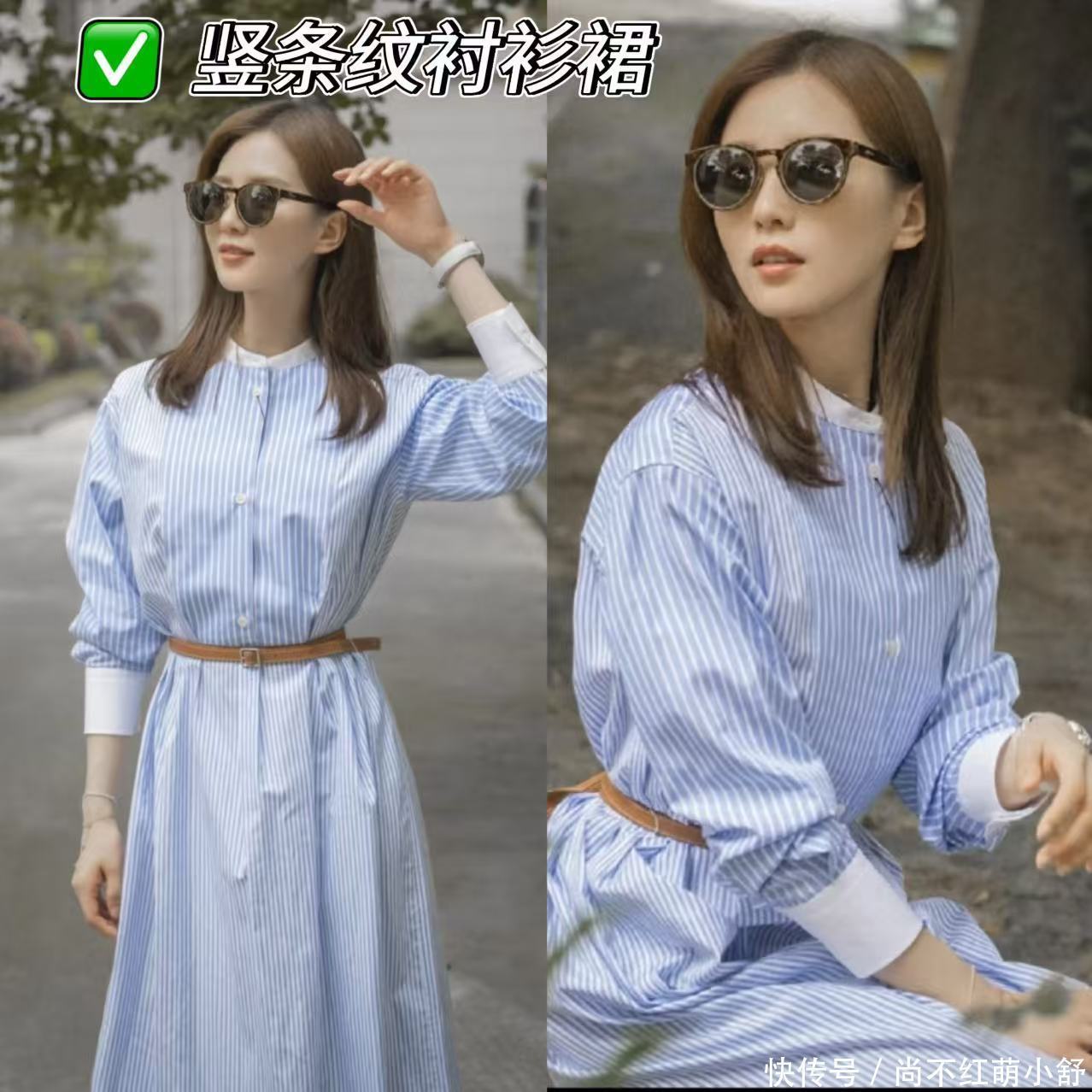 穿搭示范:不知道怎么穿搭的,不妨看诗诗的同款穿搭术。蓝+白色竖条纹衬衫裙,搭配棕色腰带切割比例,这种撞色的分割,即使你是155小格子,也能轻松穿出170的高个子气场。